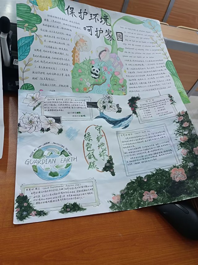 本次活动中,同学们拿起画笔,发挥创意,绘制出了一幅幅色彩丰富、立意鲜明的手抄报和电子海报。在同学们创作的作品中,有的流露出对环境恶化的担忧;有的呼吁人们停止对环境的伤害;有的则抒发了对绿色生活的向往。每幅作品紧紧围绕保护环境主题,内容充实,文体鲜明,图文并茂,生动而具有意义,将自己对“环保”、“绿色”、“低碳”的认识和体会通过手抄报和电子海报的形式展现地淋漓尽致。一幅幅用心的作品、一句句发自肺腑地呼吁,真诚地表达出了呼唤环境保护、渴望绿色家园的心声,通过色彩与文字的交汇,呼吁大家积极地参与到保护环境的行动中。