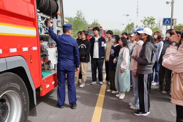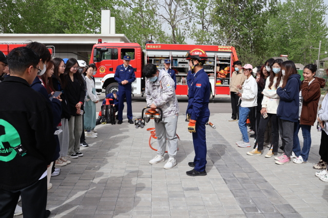 随着三辆巨大的红色消防车驶入地点,演练就此开始。消防队员们向同学们讲述了消防安全的有关知识、阐述了消防工作的意义;向同学们详细介绍了各种应急消防车辆的功能以及消防车内部各种消防设备的用途,讲述了各种救生、灭火器材的种类及其性能和操作要领,并现场演示。演示过后,同学们自告奋勇地参与到演习活动中去。有的同学在消防队员的指导下穿戴上了消防服;有的同学跟随消防员近距离参观消防车;有的同学在消防队员手把手教导下操作救生液压器械。为逼真模拟现场消防场景,消防队员在疏散开人群后,还启动了消防车的消防水枪,巨大的水幕瞬间喷涌而出,其威力引起了同学们的惊叹。活动现场氛围热烈,同学们了解到不少新的消防知识,体会到消防工作的艰难与重大,对消防队员们表达了诚挚的敬意。