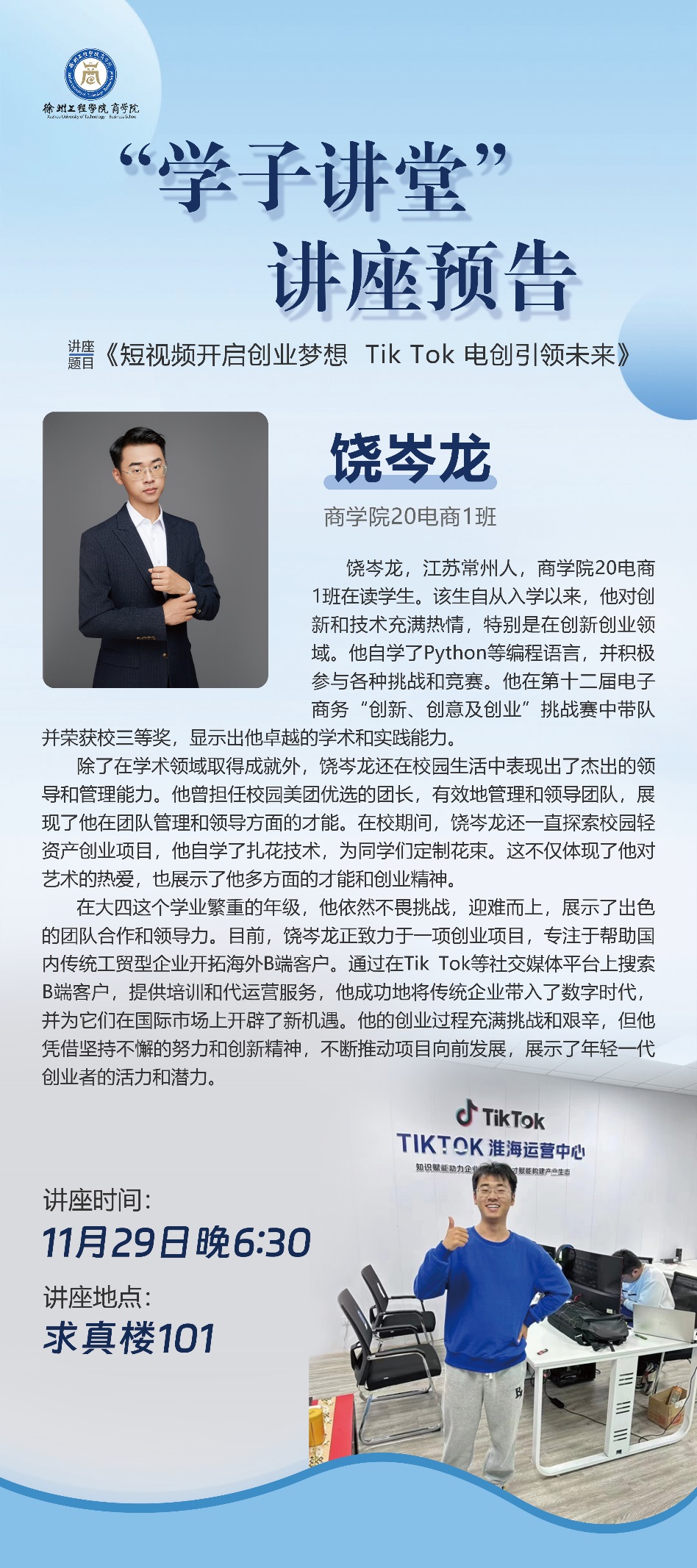 紧接着,饶岑龙学长着重介绍了目前正在从事的创业经历。他是溧阳睿晟动视电子商务服务部经营者和徐州家天下文化传媒有限公司的联合创始人。他先介绍了自己的创业背景和徐州家天下、溧阳睿晟动视的发展历程。他认为,短视频和TIK TOK等自媒体平台为创业者在电子创意领域提供了前所未有的机遇,广大同学要增强行业敏感度,积极拥抱技术变革,利用电商平台积极开拓市场和建立品牌,利用自媒体工具实现创业梦想。