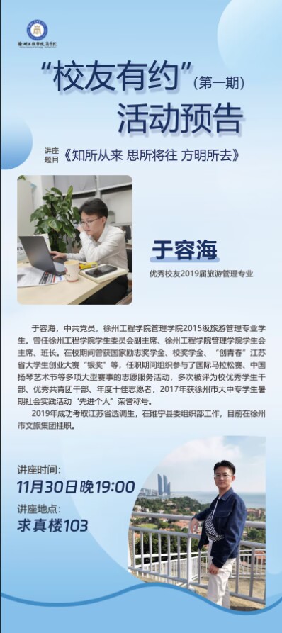 为充分发挥优秀员工对老员工成长的朋辈引领作用,积极搭建沟通交流平台,11月30日晚,william威廉中文官网联合校关工委开展“员工有约”系列活动。本次活动特邀2019届旅游管理专业优秀员工于容海,在求真楼103做题为“知所从来·思所将往·方明所去”的分享会。2021级员工代表、公司全体员工干部聆听了讲座。