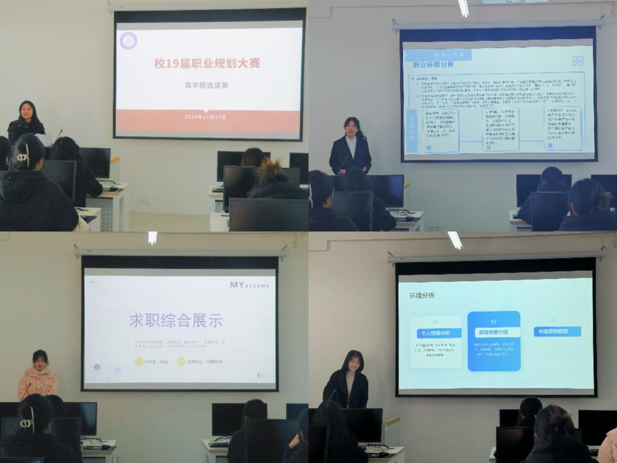 选拔赛开始,由方昭清老师带领员工抽签各自上台展示的顺序,宣读了本次活动的规则。比赛过程中,参赛选手们各显神通,通过精美的PPT演示和自信流畅的演讲,深入剖析自我,结合专业特长和市场需求,阐述了各自独具匠心的职业规划蓝图。市场营销专业的同学如陈雯琪、陈雨雪、周煜、张梦薇、张丽丽等,聚焦于市场营销,以创意十足的营销策略和对消费者心理的敏锐洞察,描绘出未来的职业发展路径。国际经济与贸易专业的同学,如甘婷、何欢乐、王晗等,立志成为资深外贸专员,详细规划了从基层岗位逐步晋升的职业蓝图。电子商务专业的同学,如贾慧娟聚焦电商领域,结合自身优势,提出了诸如成为电商平台大客户经理或电商数据分析师等职业目标。旅游管理专业的同学,如胡亚玲、卫金星、王心灵等,以丰富的旅游资源和多元的旅游市场为背景,立志成为国际旅游线路策划师,为游客打造独特旅行体验,期望从事旅游目的地营销工作,推广各地旅游文化。选手们清晰流畅的表达与沉着自信的台风,赢得了台下观众阵阵掌声。